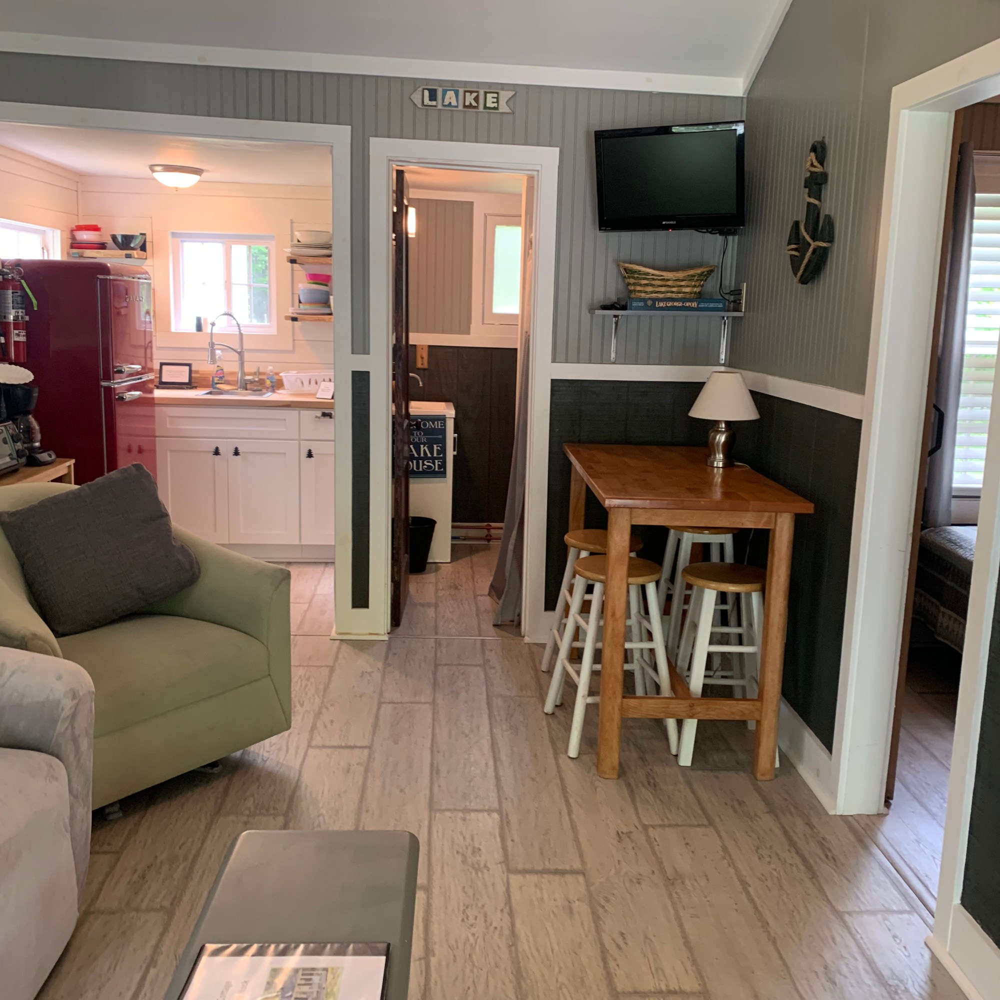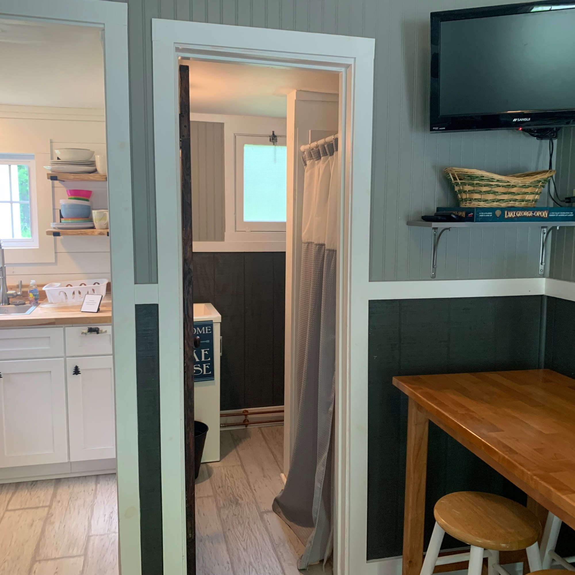 Glen, one of 5 cottages at Cozy Nook in the heart of Lake George with raised ceilings and a fresh interior design. There are two bedrooms, one with a queen bed and one with two twin beds. Kitchenette which includes cook top, refrigerator, microwave, drip coffee maker and toaster oven. Also to enjoy is your own fire pit, outside grill and lots of outdoor space to enjoy the Adirondack air.